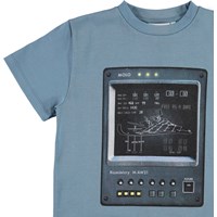 Roxo ist ein blaues T-Shirt mit einem Aufdruck des Steuerungssystems einer Weltraumrakete.