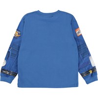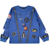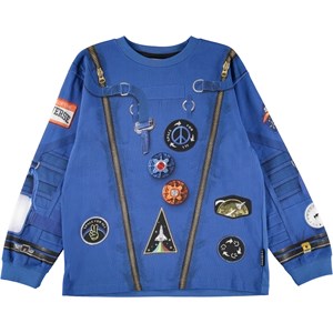 Rube ist eine blaues Langarmshirt mit einem Aufdruck von Reißverschlüssen und Weltraum-patches.