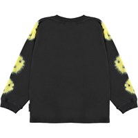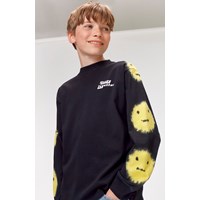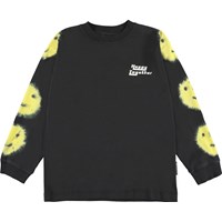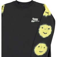 Rube ist ein schwarzes Sweatshirt mit gelben Batik-Smileys an beiden Ärmeln.
