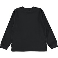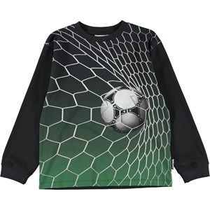 Rube ist ein schwarzes Langarmshirt und dem Aufdruck eines Tores mit einem Fußball auf der Vorderseite.