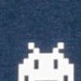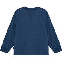 Blaue Bluse aus Öko-Baumwolle mit langen Ärmeln, Rundhalsausschnitt und geripptem Saum an Ausschnitt und Ärmeln. Sie hat eine lockere Passform und einen Platzdruck auf der Vorderseite, inspiriert von altmodischen Pixel- und Bildschirmgrafiken. Mit Verweisen auf alte Arcade-Spiele und Tetris kann man kleine Figuren sehen, die oben auftauchen und nach unten wandern.