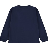 Dunkelblaues Langarmshirt aus Öko-Baumwolle mit geripptem Ausschnitt und Ärmeln. Das Langarmshirt hat eine lockere Passform mit einem Druck des Mannes auf dem Mond und einer Spiegelung von Planeten in der Maske.