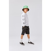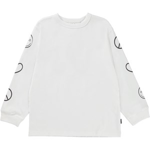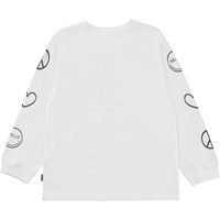 Rube ist ein weißes, langärmliges T-Shirt mit einem Print aus Peace-Zeichen, Smileys und Herzen auf den Ärmeln. Das T-Shirt ist am Hals und an den Handgelenken gerippt.