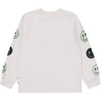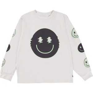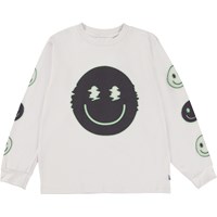 Weißes Langarm-T-Shirt mit Placement-Print in Schwarz und Grün. Der Druck zeigt das klassische lächelnde Symbol, das einen anderen und lustigen Ausdruck animmmt, als ein Fehler auf dem Bildschirm die Augen zum Flackern bringt. Wie ein digitales Augenzwinkern. Dieses langärmeliges T-Shirt besteht aus 100% Baumwolle, hat einen Rundhalsausschnitt mit Rüschenbündchen, gerippten Bündchen und eine lockere Passform. Kombinieren Sie es mit einem kurzärmligen T-Shirt, für einen coolen Schicht-auf-Schicht-Look.