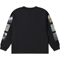 Schwarze Öko-Baumwollbluse mit langen Ärmeln, Rundhalsausschnitt und geripptem Abschluss an Hals und Ärmeln. Sie hat eine lockere Passform und einen platzierten Druck auf der Vorderseite und den Ärmeln. Der Druck zeigt Bildschirme, auf denen verschiedene Bilder angezeigt werden. Zum Beispiel kann man auf einem Bildschirm ein UFO sehen, auf einem anderen eine Raumrakete und auf einem dritten die Pyramiden. Sie alle flackern leicht und verleihen ihnen einen coolen Science-Fiction-Look.
