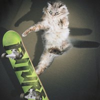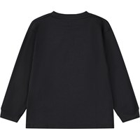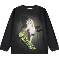 Schwarzes Langarmshirt aus Öko-Baumwolle mit geripptem Ausschnitt und Ärmeln. Das Langarmshirt hat eine lockere Passform und einen Frontdruck mit einer Katze auf einem Skateboard.
