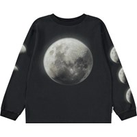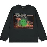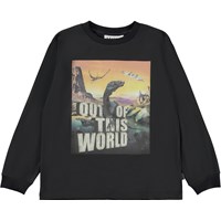 Schwarzes Langarm-T-Shirt mit Retro-Placement-Print auf der Vorderseite. Auf dem Druck ist ein Raumschiff zu sehen, das sich auf den Planeten der Dinosaurier verirrt hat. Oder ist es vielleicht gar kein anderer Planet, vielleicht ist es die Erde, aber in einem ganz anderen Zeitalter als unserem? Was denkst du? Dieses langärmeliges T-Shirt aus 100% Baumwolle hat einen Rundhalsausschnitt mit gerippten Bündchen, gerippten Bündchen und einer lockereren Passform.