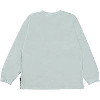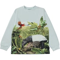 Rube ist ein hellblaues Langarm-T-Shirt mit Aufdrucken von Tapiren im Dschungel und Papageien in den Palmen. Das T-Shirt ist am Hals und an den Handgelenken gerippt.