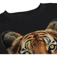 Graues, langärmliges Oberteil aus weicher Öko-Baumwolle mit gerippten Kanten am Hals und an den Ärmeln. Das Oberteil hat eine lockere Passform mit einem Tigerprint auf der Vorderseite.