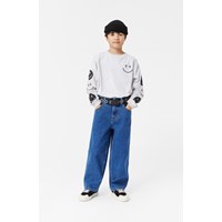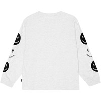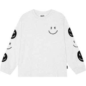 Hellgraue Melange-Bluse aus Öko-Baumwolle mit langen Ärmeln, Rundhalsausschnitt und geripptem Abschluss an Ausschnitt und Bündchen. Sie hat eine lockere Passform und einen platzierten Druck auf der Vorderseite und entlang beider Ärmel. Der Druck besteht aus lächelnden Gesichtern mit dem Text "You, Me, Togetherness".