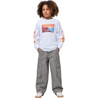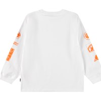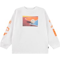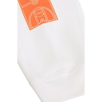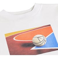 Weißes, langärmliges Oberteil aus weicher Öko-Baumwolle mit gerippten Kanten an Hals und Ärmeln. Das Oberteil hat eine lockere Passform mit einem von Basketball inspirierten Druck auf der Vorderseite und den Ärmeln.