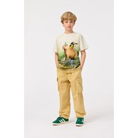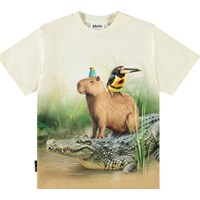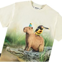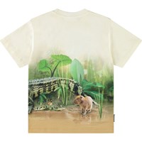 Beiges T-Shirt aus Öko-Baumwolle mit kurzen Ärmeln und geripptem Ausschnitt. Das T-Shirt hat eine lockere Passform und zeigt einen Druck von Amazonas-Tieren und schönen Farben, die sich auch auf der Rückseite fortsetzen.