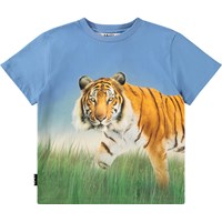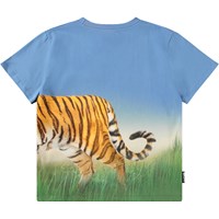 Blaues T-Shirt aus Öko-Baumwolle mit kurzen Ärmeln und geripptem Halsausschnitt. Das T-Shirt hat eine lockere Passform mit einem Druck eines Tigers, der sich von vorne nach hinten erstreckt.
