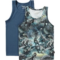 2er-Pack Tanktops aus Öko-Baumwolle. Das Set enthält ein dunkelblaues Tanktop und eines mit einem lebendigen Allover-Print von Dinosauriern.