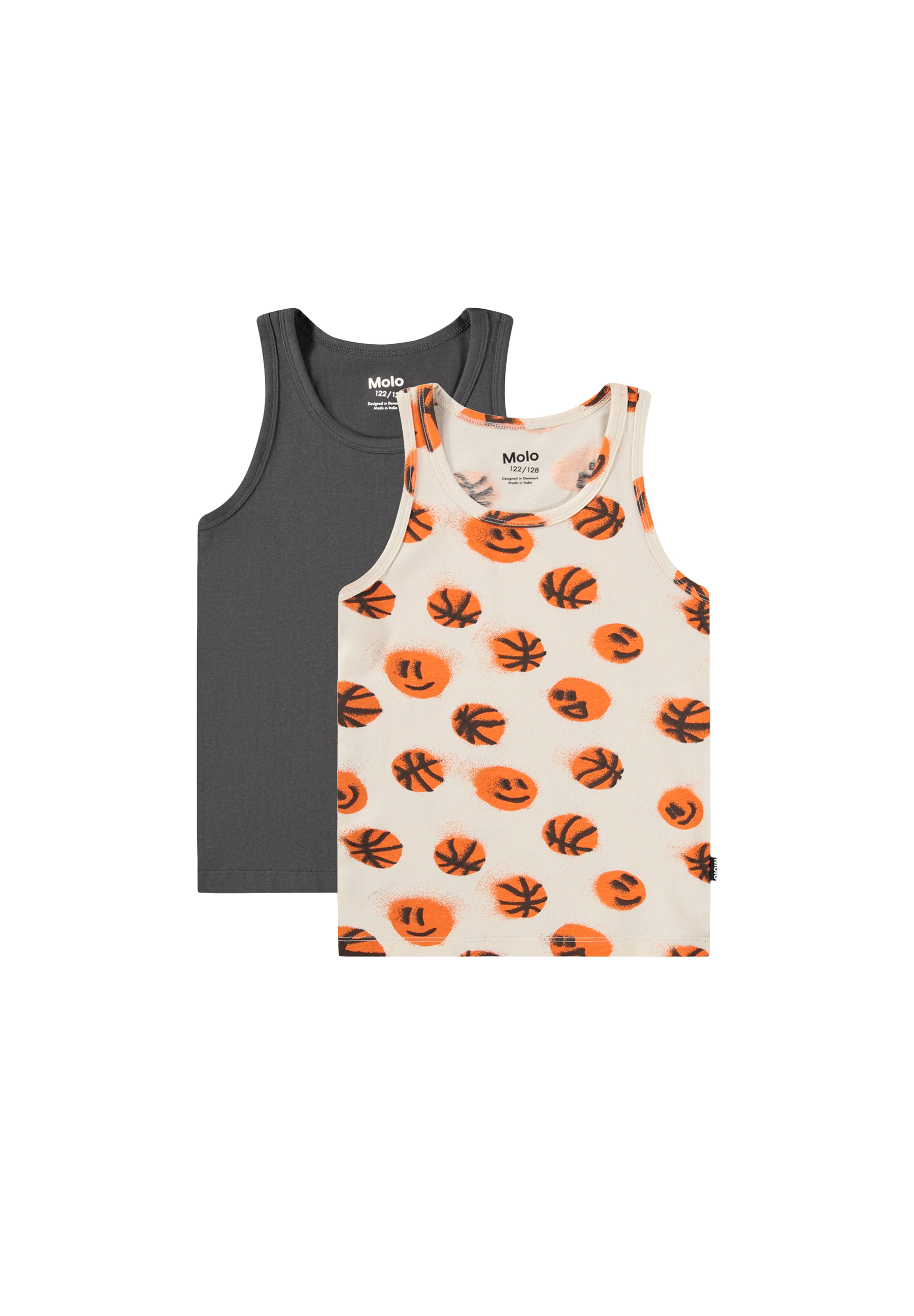 2er-Pack Westen aus weicher, ökologischer Baumwolle mit breiten Trägern und rundem Ausschnitt. Das Paket enthält eine graue und eine beige mit einem Druck von lächelnden Basketbällen.