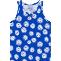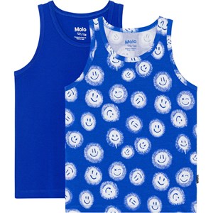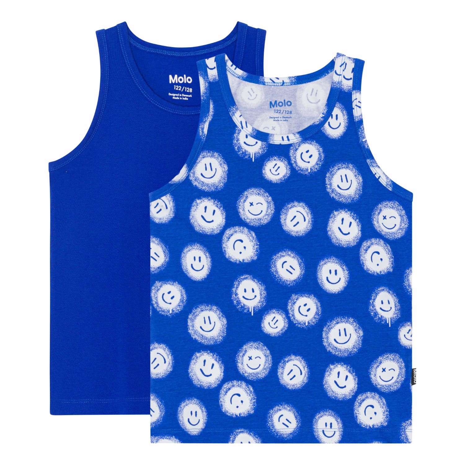 2er-Pack Öko-Unterhemden. Ein Blau und ein Blau mit lächelnden Gesichtern in Weiß.