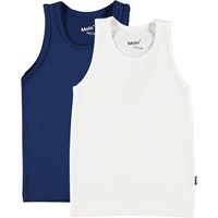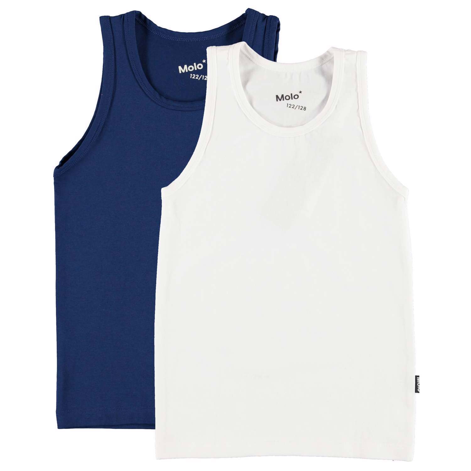 Das Jayden 2er-Pack besteht nicht nur aus einem, sondern aus zwei Tanktops – eines in Blau und eines in Weiß. Im Nacken ist das Molo-Logo in Kontrastfarbe aufgedruckt.