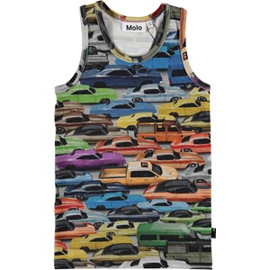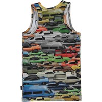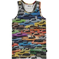 Jim ist eine Unterhemd mit dem Aufdruck 'Cars', einem Aufdruck voller farbiger Autos.
