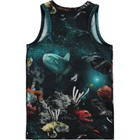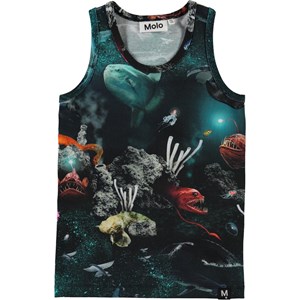 Jim ist ein Unterhemd mit Drucken der Tiefsee, wo es viele verschiedene Fische gibt.
