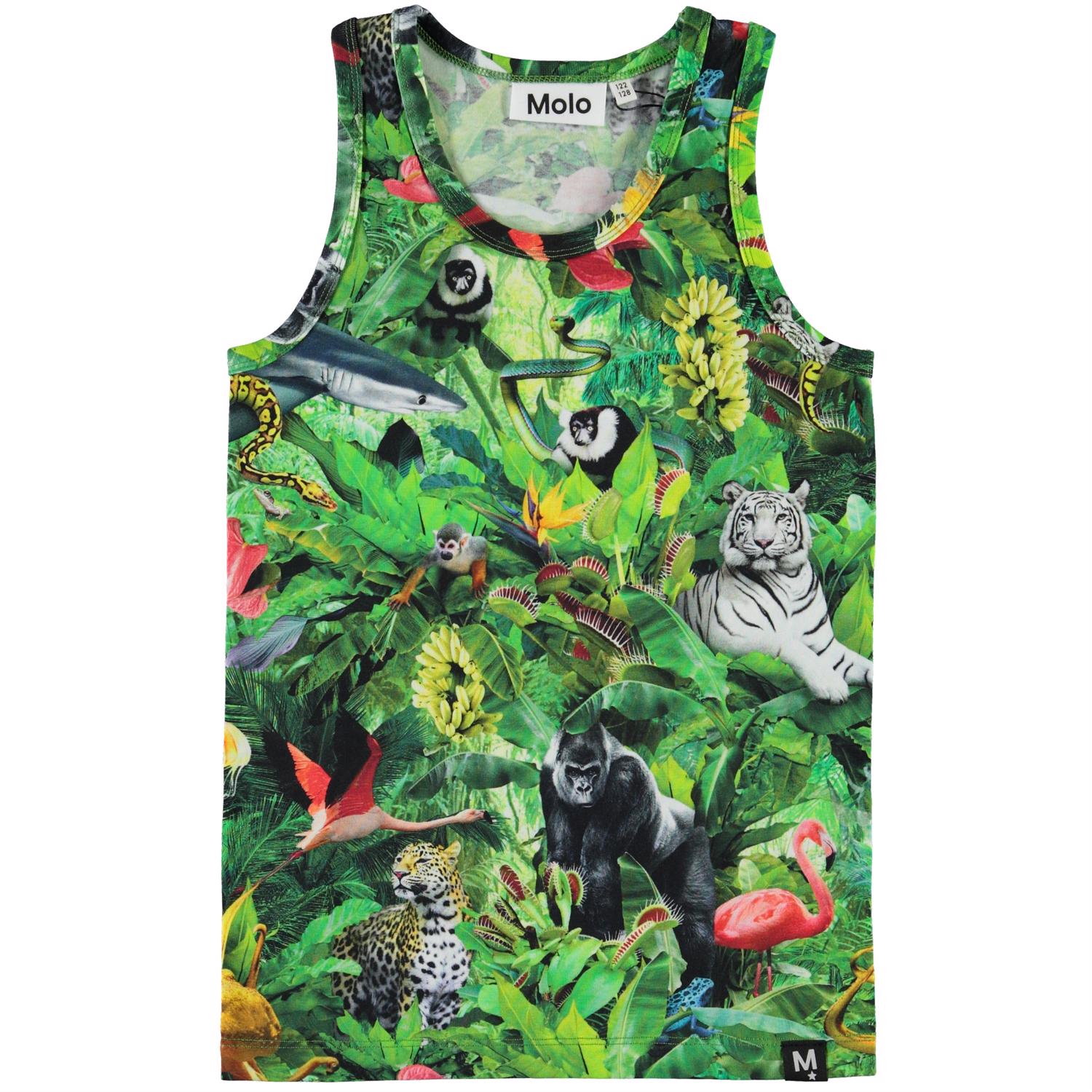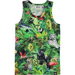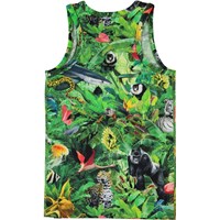 Jim ist ein Unterhemd mit 'Fantasy Jungle'-Druck, mit vielen verschiedenen Tieren im Dschungel, die in der Regel sich dort nicht befinden. Ecocert Greenlife, certifikationsnr. 197496.