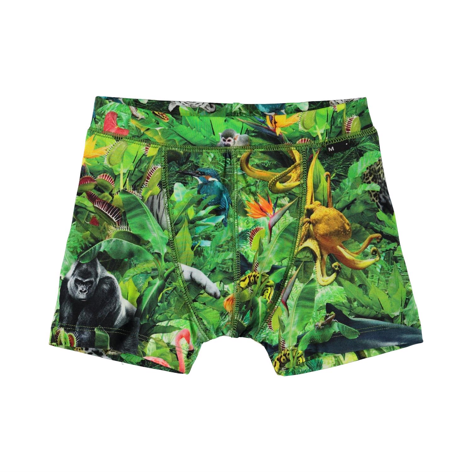 Boxershorts mit aufgedruckten 'Fantasy Jungle', mit vielen verschiedenen Tieren im Dschungel, die in der Regel sich dort nicht befinden. Ecocert Greenlife, certifikationsnr. 197496.