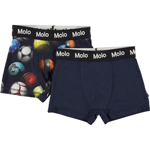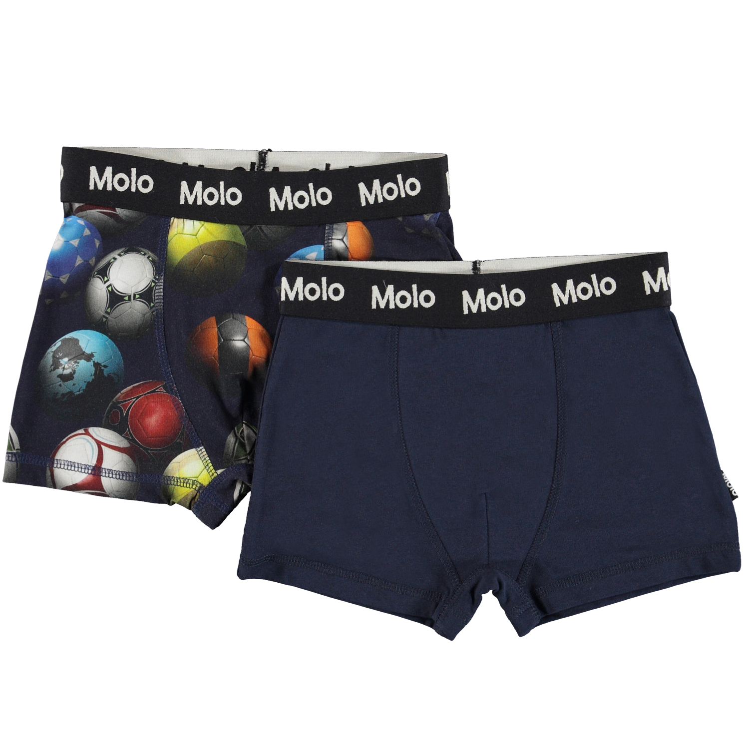 Packung mit zwei Paar Boxershorts. Ein Paar in Blau und das andere mit Aufdrucken verschiedener Fußbälle. Die Boxershorts haben einen breiten elastischen Bund für guten Komfort.