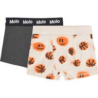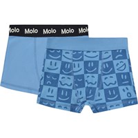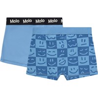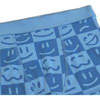 2er-Pack Boxershorts aus weicher, ökologischer Baumwolle mit einem breiten elastischen Bund für einen bequemen Tragekomfort. Das Pack enthält ein Paar blaue Boxershorts und ein Paar karierte mit einem Druck von Gesichtern mit verschiedenen Ausdrücken.