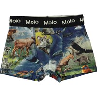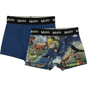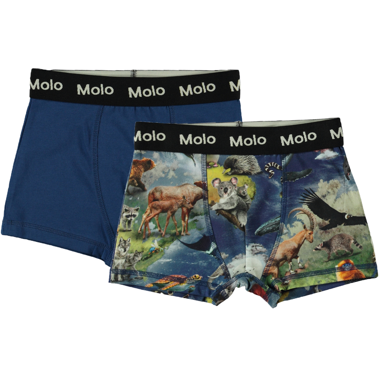 Packung mit zwei Paar Boxershorts aus Öko-Baumwolle. Eine ist dunkelblau und die andere hat Aufdrucke der Kontinente unserer Erde sowie der verschiedenen Tiere, die in verschiedenen Teilen der Welt leben. Die Boxershorts haben einen breiten elastischen Bund für guten Tragekomfort.