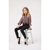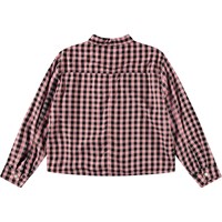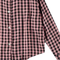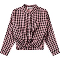 Langärmeliges rosa und schwarz kariertes Hemd aus weicher Viskose. Das Hemd hat einen klassischen Kragen, eine Knopfleiste vorne und Manschetten mit Knopfverschluss. Es ist so gestaltet, dass es vorne am Bauch verknotet werden kann.