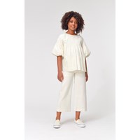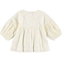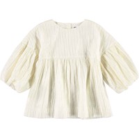 Raja ist ein schöner Pullover in Weiß mit Metallic-Streifen und leicht gepufften Ärmeln. Der Pullover hat einen Reißverschluss am Hals.