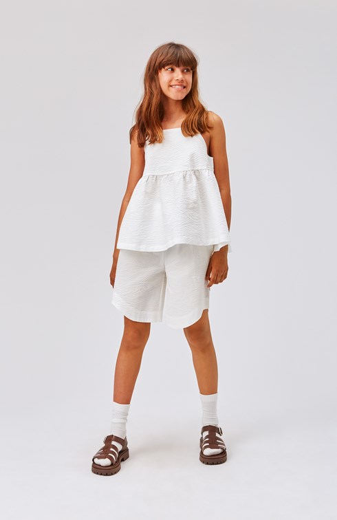 Rani ist ein weißes Trägertop aus gewellter Baumwolle. Rani hat eine lockere Passform und einen Schnitt in der Taille, der einen voluminösen Effekt erzeugt.