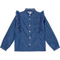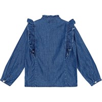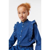 Langärmeliges, locker sitzendes Jeanshemd aus Öko-Baumwolle. Das Hemd hat einen Mandarin-Kragen mit einer kleinen Rüschenkante, kleine Perlmuttknöpfe und eine elegante Rüschenverzierung auf den Schultern, die sich vorne und hinten erstreckt. Die Ärmel haben eine kleine Manschette mit einem Schlitz und einem Knopfverschluss.