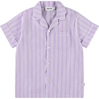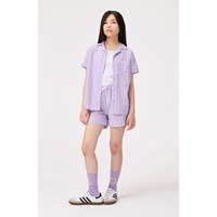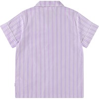 Weißes und lila gestreiftes T-Shirt aus Öko-Baumwolle. Das Shirt hat eine lockere Passform, einen Button-Down-Kragen, eine Brusttasche und hochgekrempelte Ärmel.