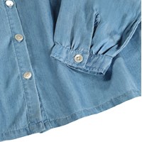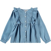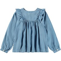 Leichtes und luftiges Hemd in weichem, hellblauem Denim-Look mit femininen Rüschendetails entlang der Brust und Schultern. Das Hemd hat lange Ärmel mit Manschetten und einen Knopfverschluss vorne. Der Schnitt ist locker und bequem, was es perfekt für sowohl den Alltag als auch festliche Anlässe macht.