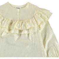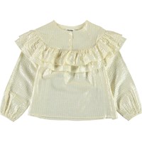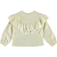 Rexanna ist eine hellgelbe Hemdbluse aus Baumwolle mit Metallfaden, die der Bluse eine schöne glänzende Oberfläche verleiht. Die Bluse hat eine Rüschenkante über der Brust und Knöpfe am Hals.