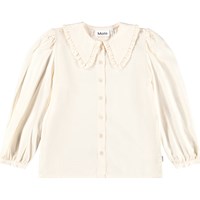 Cremefarbenes Shirt aus weicher Viskose, das angenehm zu tragen ist. Das Shirt hat einen klassischen Peter Pan-Kragen mit dekorativen Rüschen, lange voluminöse Ärmel mit schmalen Manschetten und eine Knopfleiste vorne mit weißen Knöpfen.