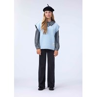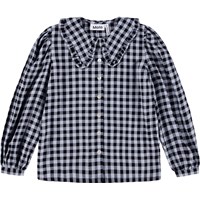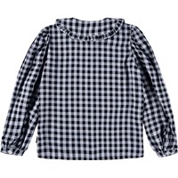 Blau-schwarzes kariertes Hemd aus weicher Viskose, das angenehm zu tragen ist. Das Hemd hat einen Peter-Pan-Kragen mit dekorativen Rüschen, lange voluminöse Ärmel mit schmalen Manschetten und eine Knopfleiste vorne mit weißen Knöpfen.