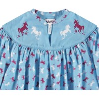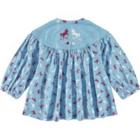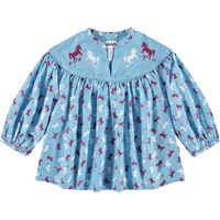 Hellblaues locker sitzendes Shirt aus einer weichen Baumwoll- und Viskosemischung. Das Shirt verfügt über eine solide Passe über den Schultern mit einem V-Ausschnitt und einem Mandarin-Kragen, sowie elastische Ärmelbündchen und viele Raffungen. Das Shirt hat ein Allover-Print aus dunkelroten und weißen Pferden.