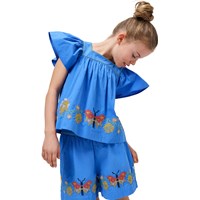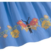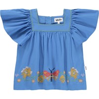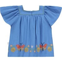 Blaue Bluse aus weicher Baumwolle mit quadratischem Ausschnitt und Schmetterlingsärmeln. Die Bluse hat einen unsichtbaren Reißverschluss am Rücken, der das An- und Ausziehen erleichtert, und es hat eine bunte Schmetterlingsstickerei am Rand.