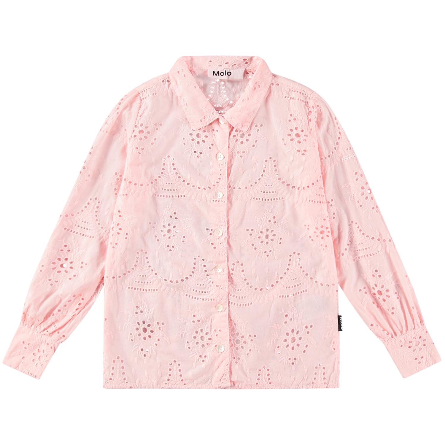 Taubiges Rosa aus Öko-Baumwolle mit Lochstickerei. Das Hemd hat lange Ärmel mit Zwei-Knopf-Manschettenverschluss, Hemdkragen und Knopföffnung vorne. Das Hemd ist locker geschnitten und lässt sich gut mit einem Rock aus dem gleichen Material und der gleichen Farbe kombinieren.