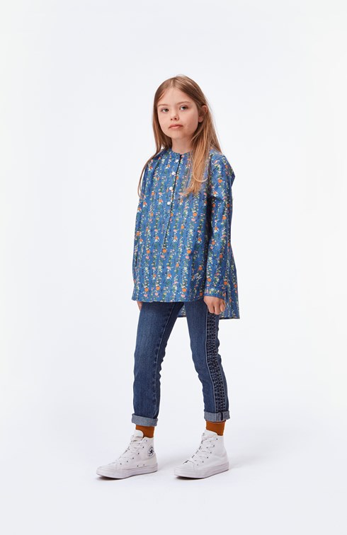 Runaris ist ein blaues oversized Hemd mit einem Druck von vertikalen Blumenreben. Das Hemd hat Knöpfe am Kragen und mehr Länge hinten.