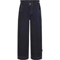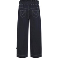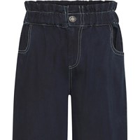 Abbey ist eine dunkelblaue Hose mit hoher Taille und lockerer Passform. Die Hose hat weiße Nähte und eine plissierte Kante in der Taille. Abbey besteht aus 100% Öko-Baumwolle.