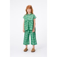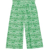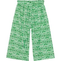 Grüne knöchellange Hose aus Öko-Baumwolle. Der Bund der Hose hat einen Rüschenrand, er ist vorne fixiert und hinten ist ein Gummizug eingenäht, dadurch hat die Hose eine gute Passform und ist angenehm zu tragen. Die Hose bietet viel Platz und einen Allover-Print aus kleinen Herzen aus weißen und grünen Blumen.