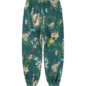 Grüne Jogginghose aus Öko-Baumwolle mit elastischem Bund, innenliegendem Kordelzug, elastischen Bündchen an den Knöcheln und Seitentaschen. Die Jogginghose hat eine normale Passform und ein schönes Blumenmuster entlang der Beine.