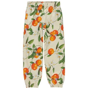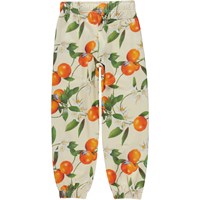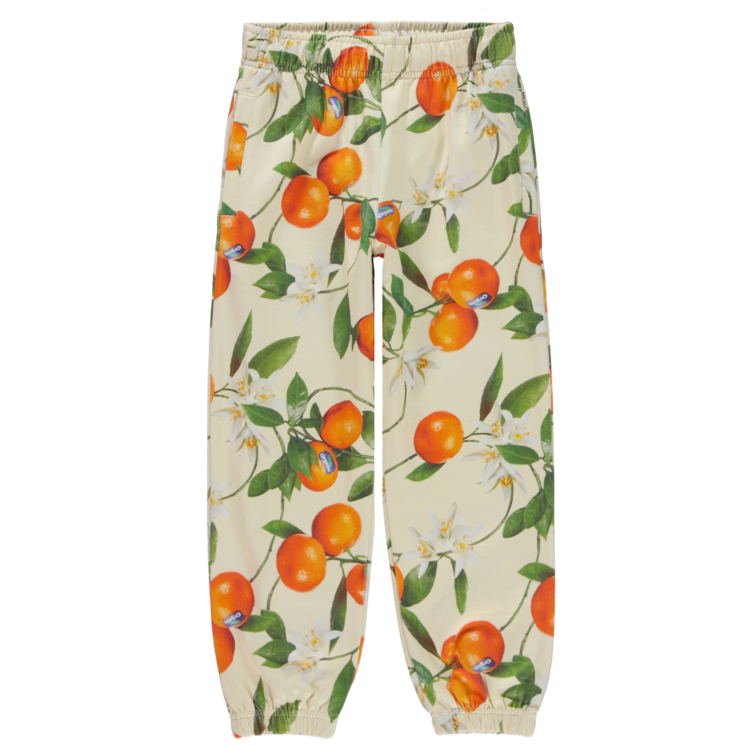 Adan ist eine hellgelbe Jogginghose aus 100 % Öko-Baumwolle. Adan hat Gummizüge in der Taille und an den Knöcheln, Seitentaschen und eine einzelne Tasche auf der Rückseite. Die Hose hat einen Allover-Print, Mandarinen, mit Orangenranken, sonnengereiften Mandarinen und Mandarinenblüten.