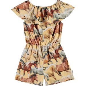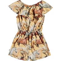 Adda ist ein Hosenanzug ohne Ärmel und mit kurzen Beinen. Der Anzug ist hellgelb mit Pferdeaufdruck. Adda hat einen elastischen Bund und einen breiten Kragen an den Schultern.
