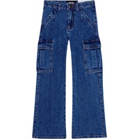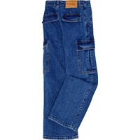 Diese Jeansblauhose ist aus Öko-Baumwolle gefertigt und hat eine ausgestellte Silhouette mit Vorder- und Gesäßtaschen. Der Bund hat Gürtelschlaufen, Knopf- und Reißverschluss sowie ein verstellbares Gummiband innen für eine bequeme Passform. Zusätzlich verfügt die Hose über große Cargo-Taschen an den Seiten und Gesäßtaschen.