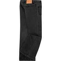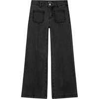 Schwarze 70er-Jahre-Jeans mit aufgenähter Druckfalte. Die Hose verfügt über einen Druckknopf- und Reißverschluss, Gürtelschlaufen und einen innenliegenden verstellbaren Knopf an der Taille, der für die perfekte Passform sorgt. Die Hose ist trompetenförmig, mit aufgesetzten Taschen vorne und sandfarbenen Nähten.