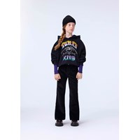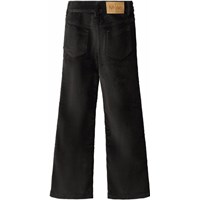 Schwarze Hose aus weichem Baumwoll-Velvet in einer trompetenförmigen Silhouette. Die Hose hat Vorder- und Gesäßtaschen. Der Bund hat einen Knopf- und Reißverschluss sowie ein internes verstellbares Gummiband für eine gute Passform.