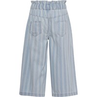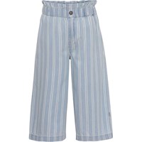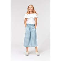 Akayla ist eine hellblaue Culotte-Hose mit weißen Streifen. Die Hose hat einen elastischen Bund mit einer kleinen Rüschenkante oben.